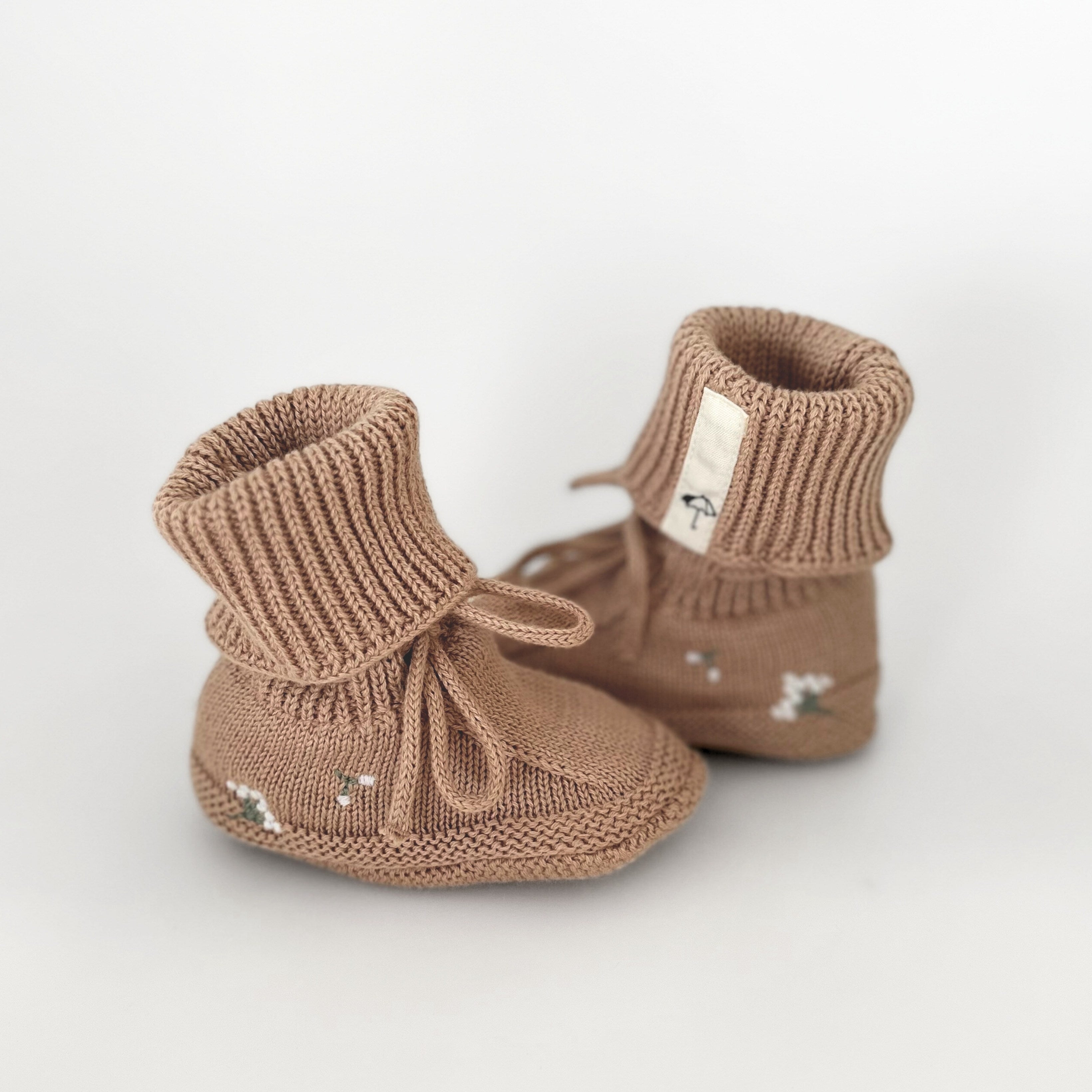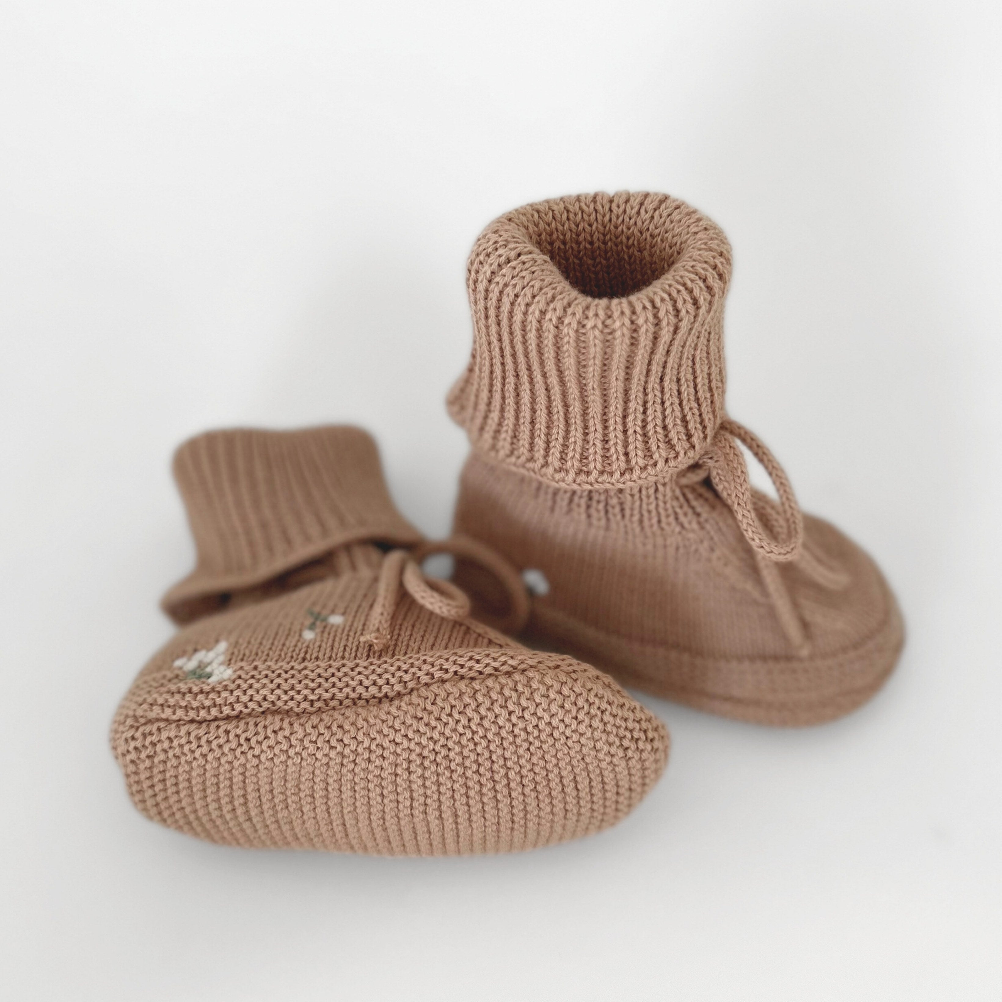 Yndige, bløde og lune futter. Omhyggeligt strikket af 100% økologisk bomuld. Futterne har fine detaljer, med broderede små blomster, der tilføjer et ekstra fint udtryk.
