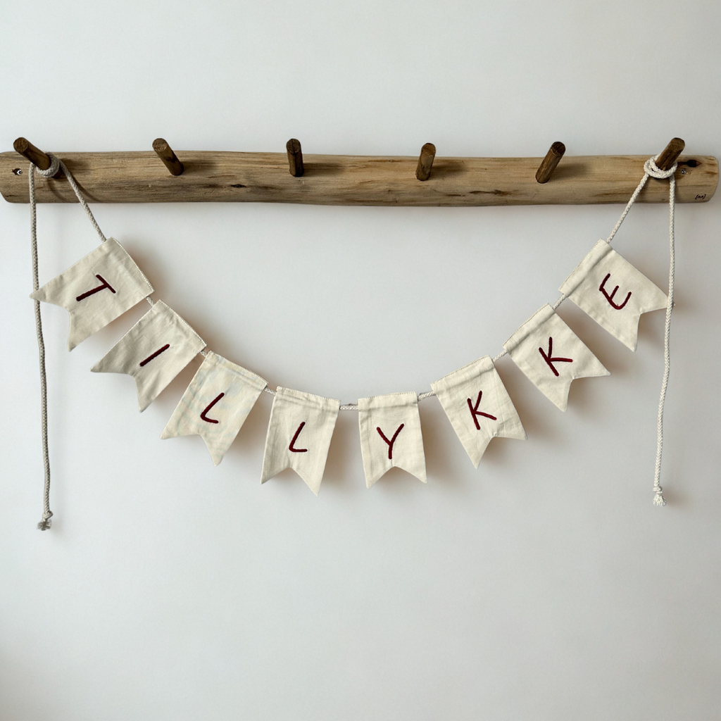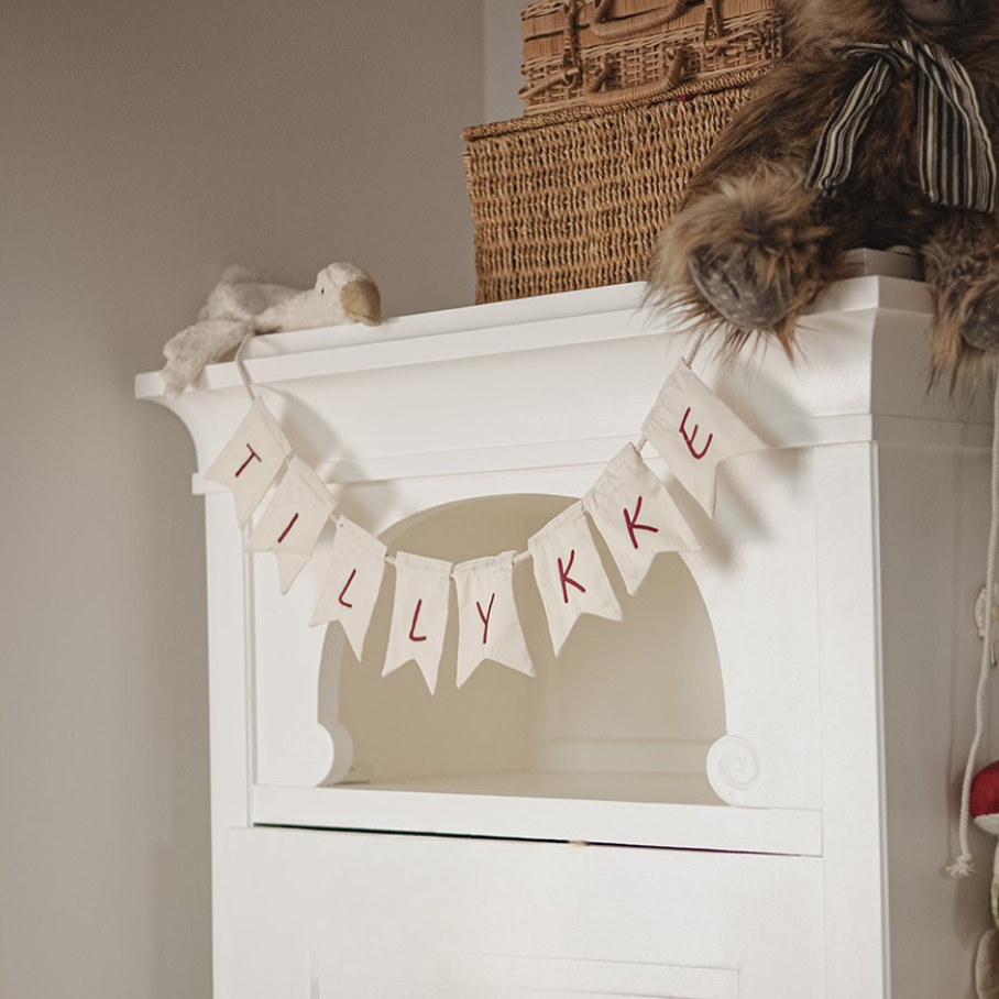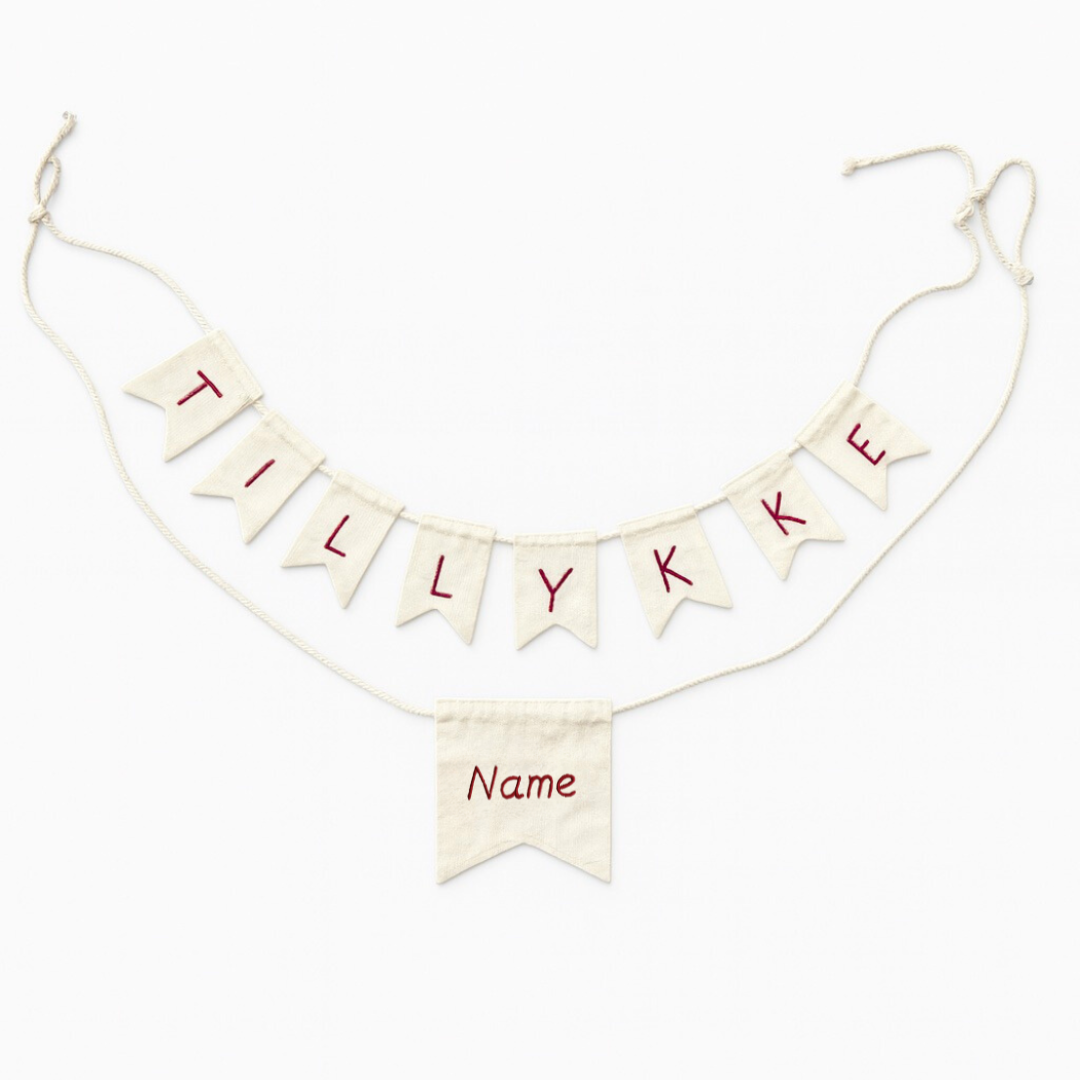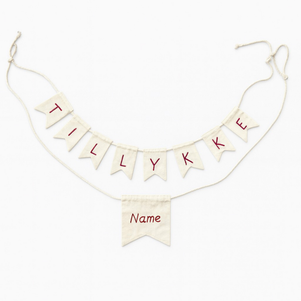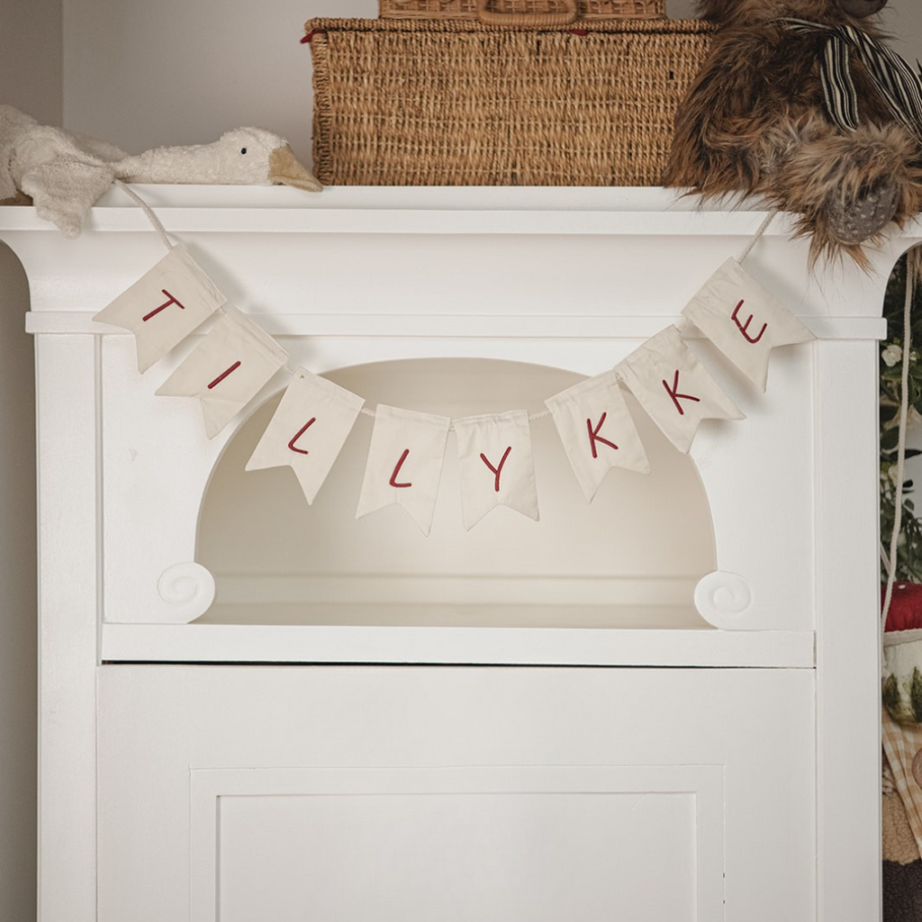 Create a truly special birthday tradition with this beautiful and timeless garland. It features 8 cream-colored flags, delicately embroidered with the Danish word “TILLYKKE” (“Congratulations”) in vibrant red thread – ready to bring joy, year after year.